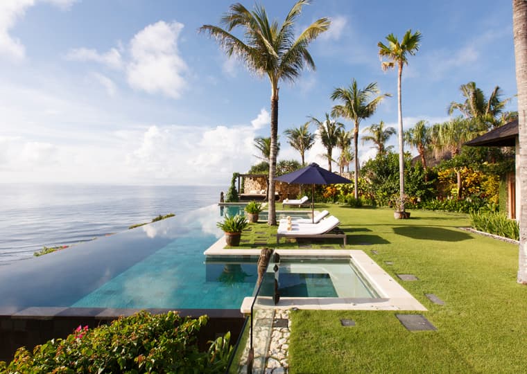 illa Tamarama features two private pools: one shaded by swaying coconut palms and the other dramatically positioned on the cliff’s edge, offering breathtaking views. The main living pavilion embodies a gorgeous Hampton’s theme, with plush white sofas surrounding a large coffee table illuminated by